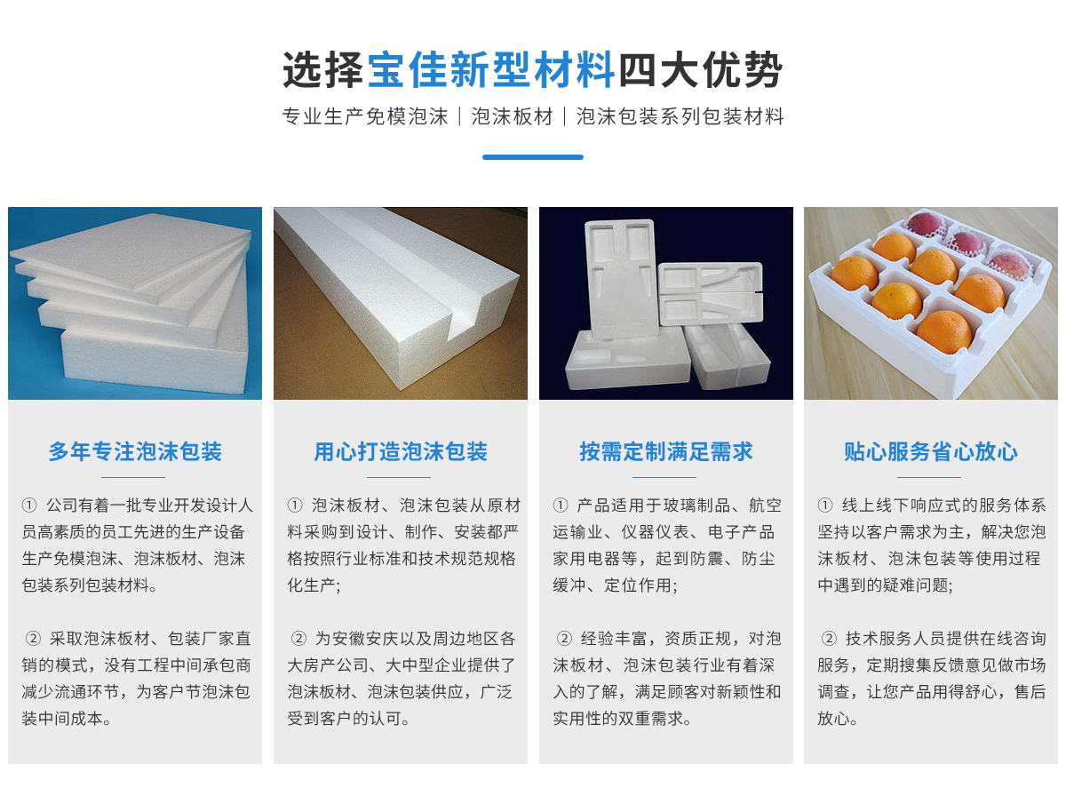 - 懷寧縣寶佳新型材料有限公司是泡沫包裝專業生產商,公司致力于產品內包裝的設計和生產為客戶解決產品的防震緩沖、定位和保溫等包裝問題本公司有著一批開發設計人員高素質的...